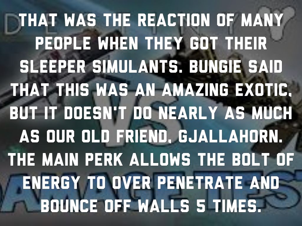 That was the reaction of many people when they got their sleeper simulants. Bungie said that this was an amazing exotic, but it doesn't do nearly as much as our old friend, gjallahorn. The main perk allows the bolt of energy to over penetrate and bounce off walls 5 times.