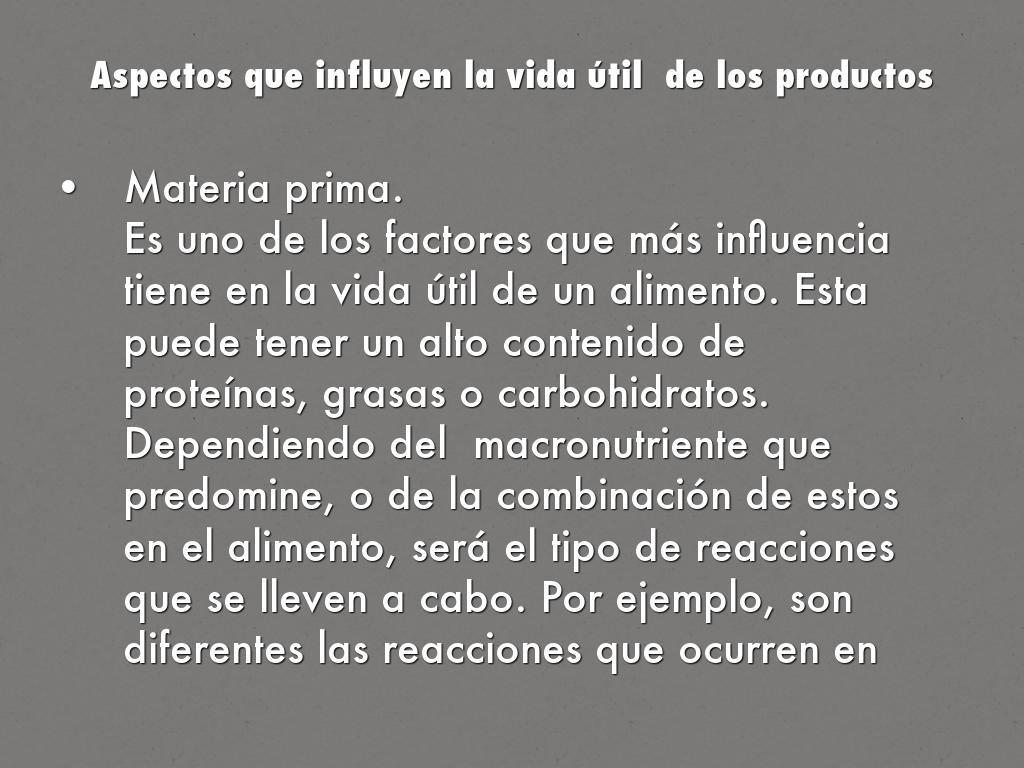 Es uno de los factores que más influencia tiene en la vida útil de un alimento. Esta puede tener un alto contenido de proteínas, grasas o carbohidratos. Dependiendo del macronutriente que predomine, o de la combinación de estos en el alimento, será el tipo de reacciones que se lleven a cabo. Por ejemplo, son diferentes las reacciones que ocurren en una carne que en un pan, o en unas galletas que en un queso.