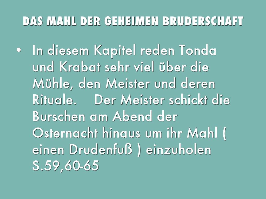 In diesem Kapitel reden Tonda und Krabat sehr viel über die Mühle, den Meister und deren Rituale. Der Meister schickt die Burschen am Abend der Osternacht hinaus um ihr Mahl ( einen Drudenfuß ) einzuholen S.59,60-65