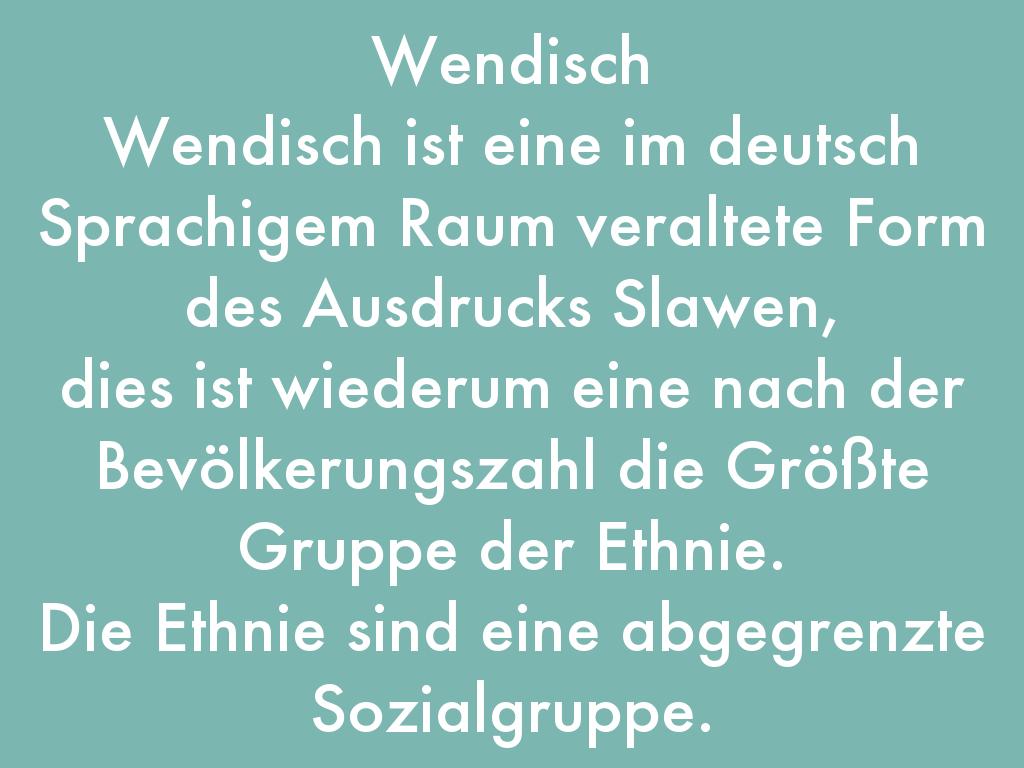 Wendisch Wendisch ist eine im deutsch Sprachigem Raum veraltete Form des Ausdrucks Slawen, dies ist wiederum eine nach der Bevölkerungszahl die Größte Gruppe der Ethnie. Die Ethnie sind eine abgegrenzte Sozialgruppe.