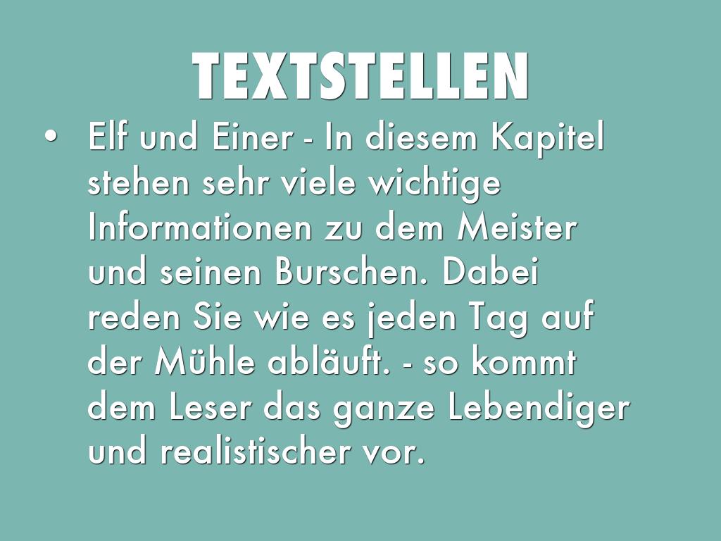 Elf und Einer - In diesem Kapitel stehen sehr viele wichtige Informationen zu dem Meister und seinen Burschen. Dabei reden Sie wie es jeden Tag auf der Mühle abläuft. - so kommt dem Leser das ganze Lebendiger und realistischer vor.