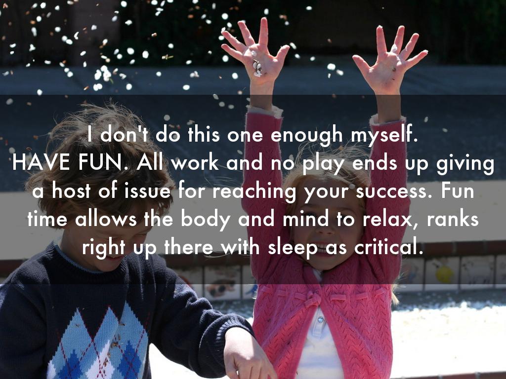 HAVE FUN. All work and no play ends up giving a host of issue for reaching your success. Fun time allows the body and mind to relax, ranks right up there with sleep as critical.