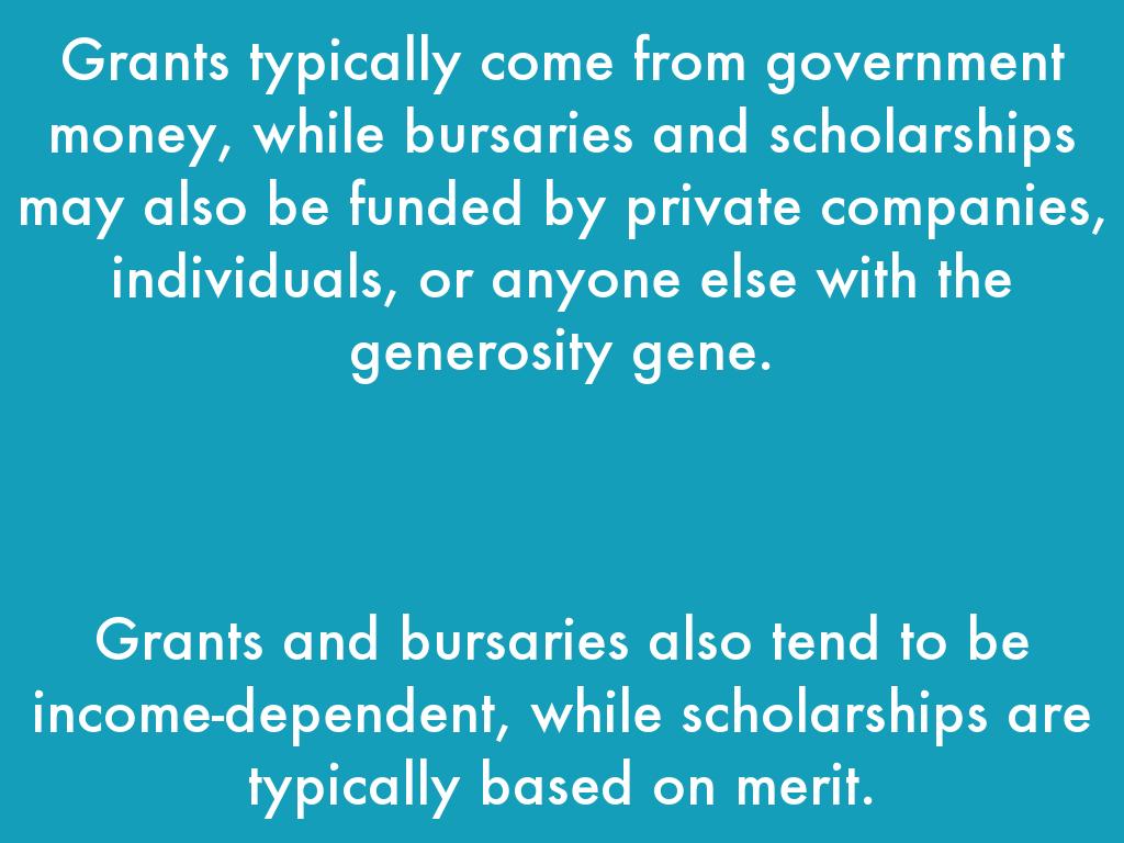 Grants typically come from government money, while bursaries and scholarships may also be funded by private companies, individuals, or anyone else with the generosity gene.