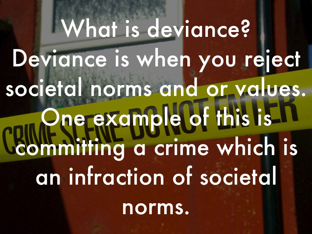 What is deviance? Deviance is when you reject societal norms and or values. One example of this is committing a crime which is an infraction of societal norms.