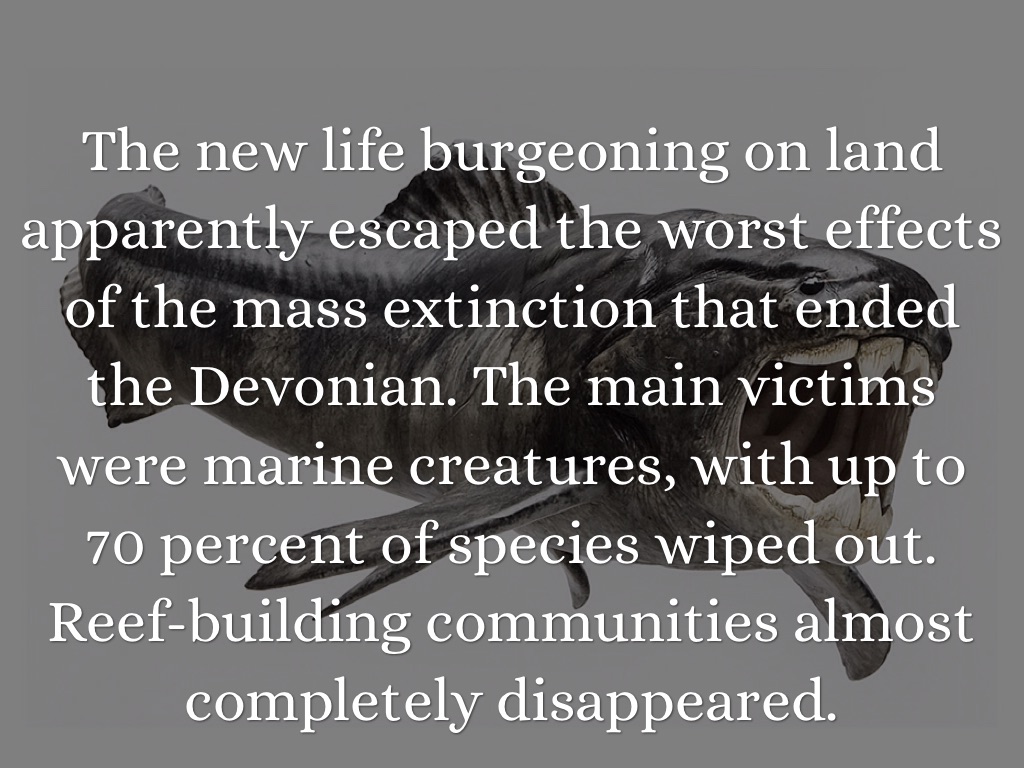 The new life burgeoning on land apparently escaped the worst effects of the mass extinction that ended the Devonian. The main victims were marine creatures, with up to 70 percent of species wiped out. Reef-building communities almost completely disappeared.