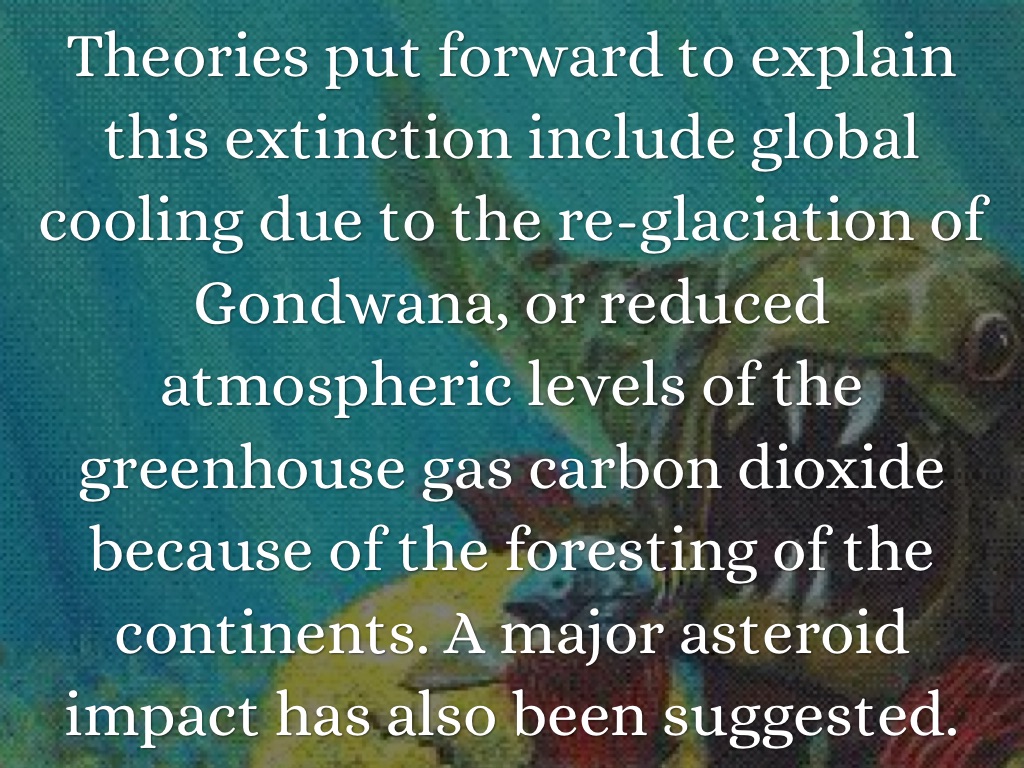 Theories put forward to explain this extinction include global cooling due to the re-glaciation of Gondwana, or reduced atmospheric levels of the greenhouse gas carbon dioxide because of the foresting of the continents. A major asteroid impact has also been suggested.