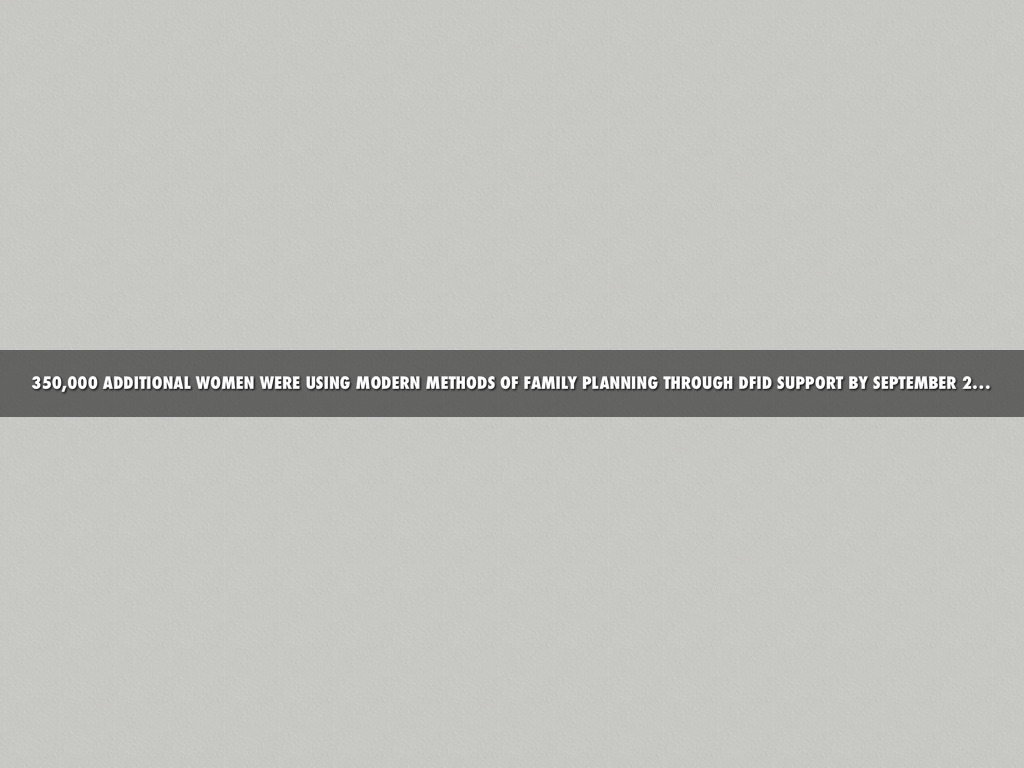 350,000 ADDITIONAL WOMEN WERE USING MODERN METHODS OF FAMILY PLANNING THROUGH DFID SUPPORT BY SEPTEMBER 2014.