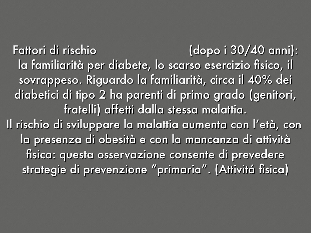 la familiarità per diabete, lo scarso esercizio fisico, il sovrappeso. Riguardo la familiarità, circa il 40% dei diabetici di tipo 2 ha parenti di primo grado (genitori, fratelli) affetti dalla stessa malattia.