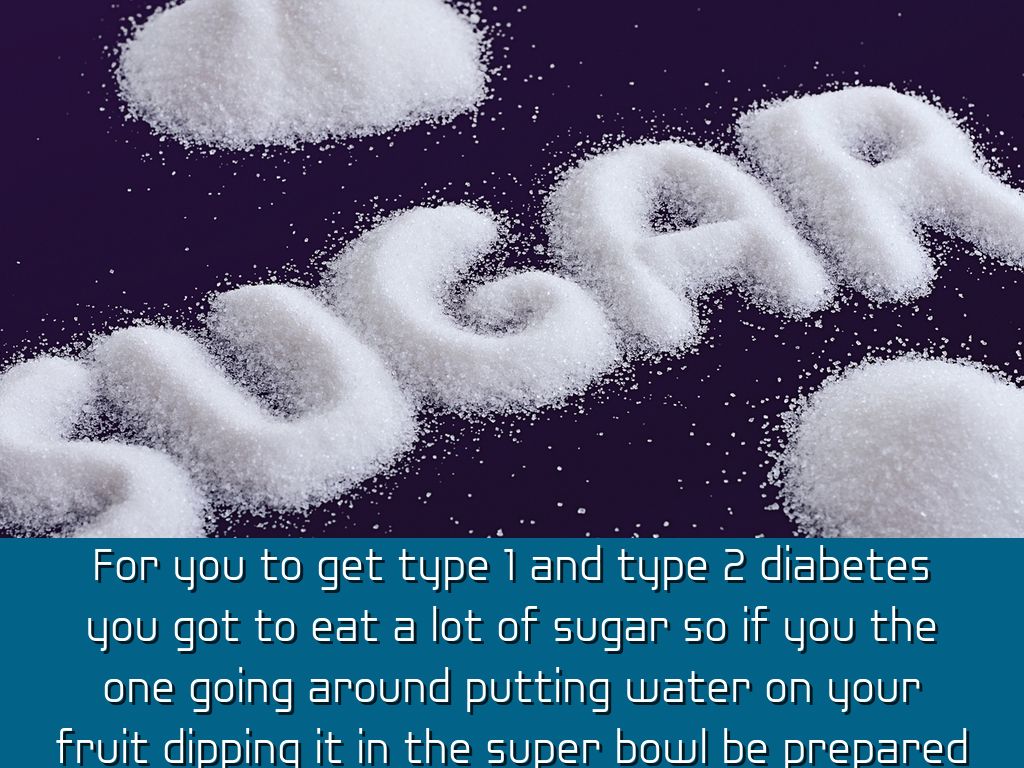 For you to get type 1 and type 2 diabetes you got to eat a lot of sugar so if you the one going around putting water on your fruit dipping it in the super bowl be prepared you don't have to gain wight to have diabetes .