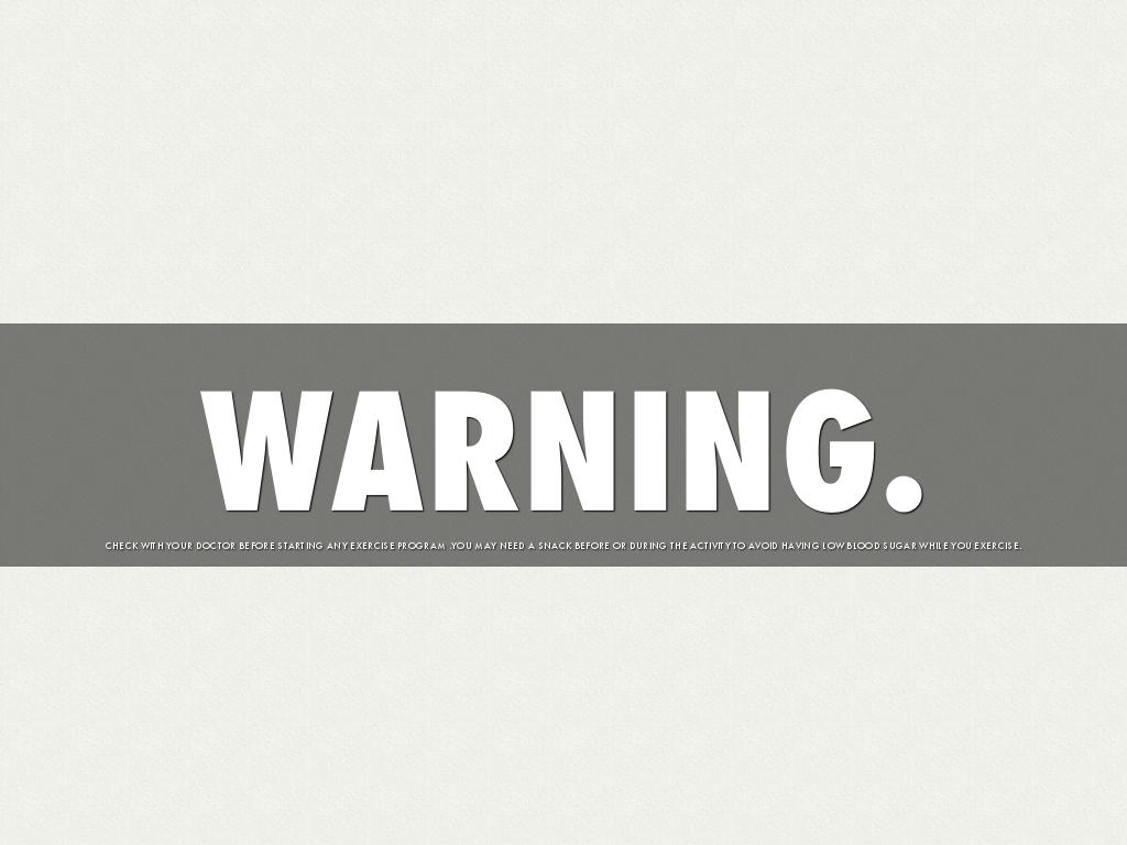 CHECK WITH YOUR DOCTOR BEFORE STARTING ANY EXERCISE PROGRAM .YOU MAY NEED A SNACK BEFORE OR DURING THE ACTIVITY TO AVOID HAVING LOW BLOOD SUGAR WHILE YOU EXERCISE.