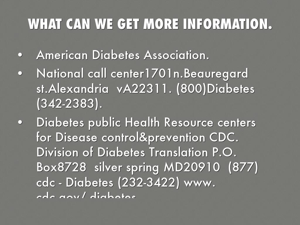 Diabetes public Health Resource centers for Disease control&prevention CDC. Division of Diabetes Translation P.O. Box8728 silver spring MD20910 (877) cdc - Diabetes (232-3422) www.