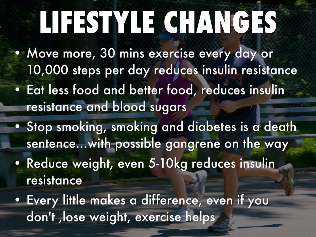 Move more, 30 mins exercise every day or 10,000 steps per day reduces insulin resistance