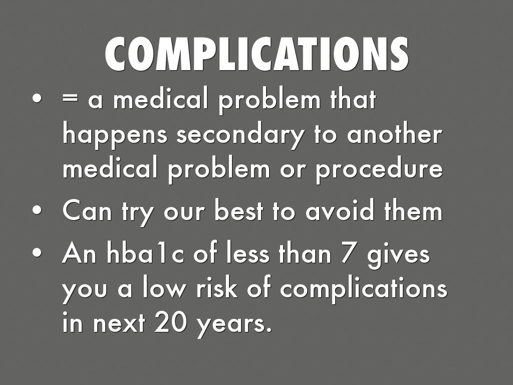 An hba1c of less than 7 gives you a low risk of complications in next 20 years.