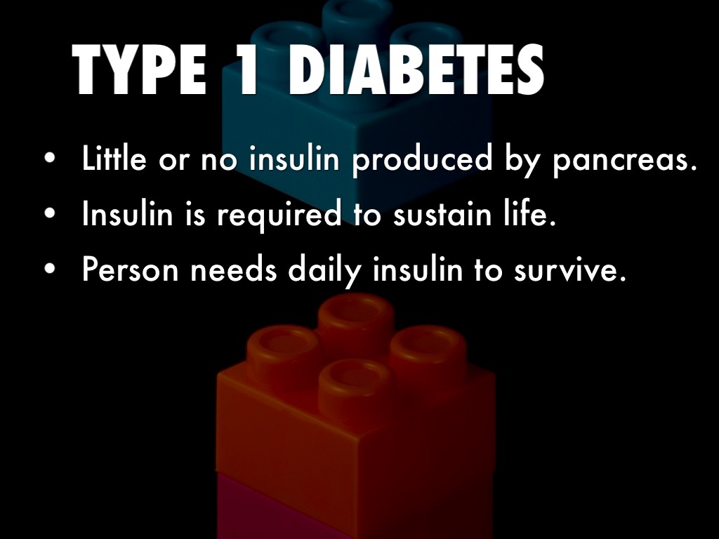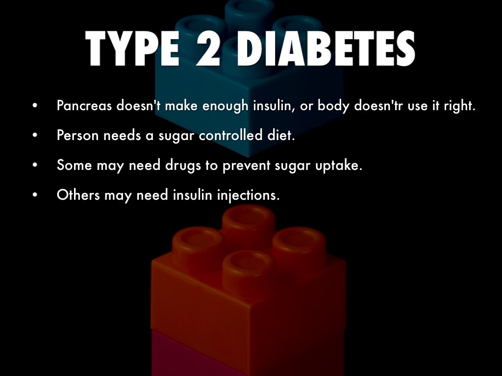 Pancreas doesn't make enough insulin, or body doesn'tr use it right.