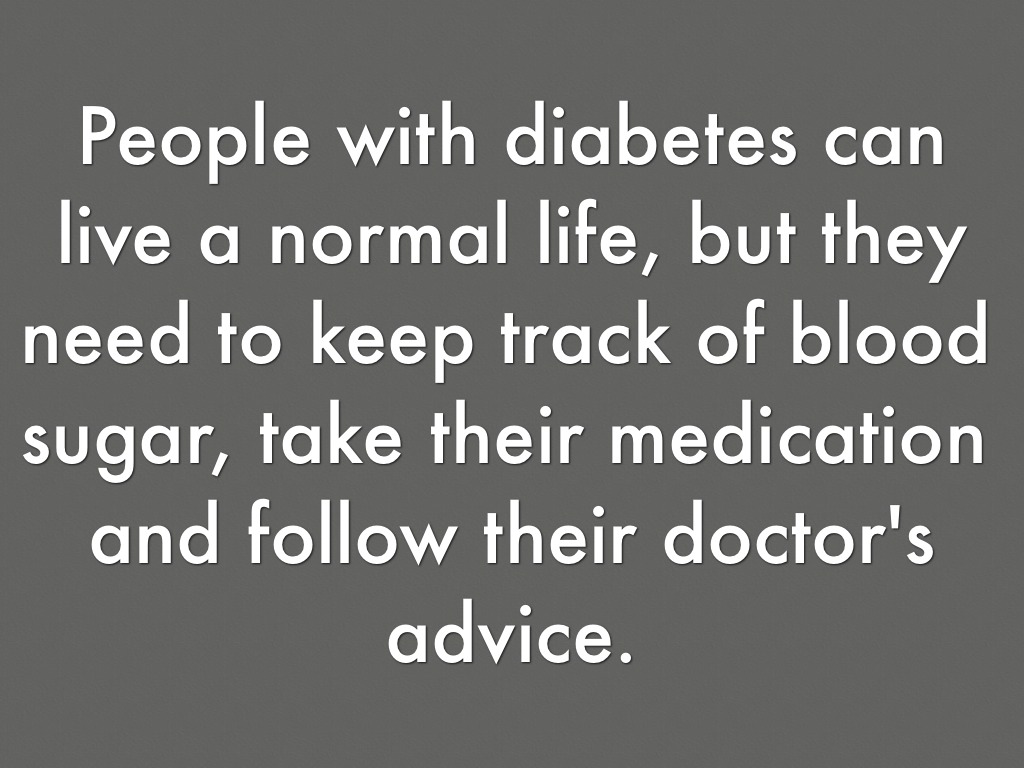 People with diabetes can live a normal life, but they need to keep track of blood sugar, take their medication and follow their doctor's advice.