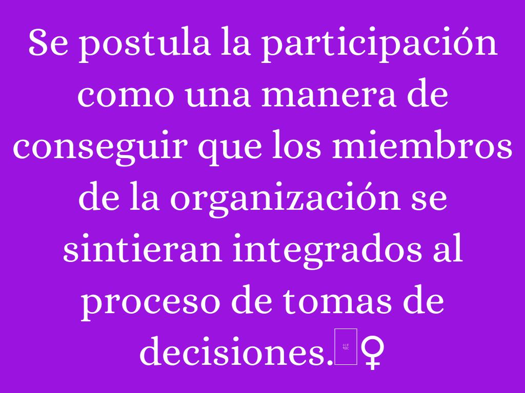 Se postula la participación como una manera de conseguir que los miembros de la organización se sintieran integrados al proceso de tomas de decisiones.🤼‍♀️