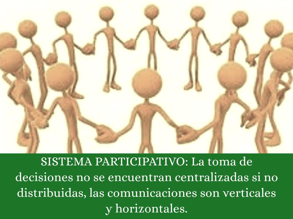 SISTEMA PARTICIPATIVO: La toma de decisiones no se encuentran centralizadas si no distribuidas, las comunicaciones son verticales y horizontales.