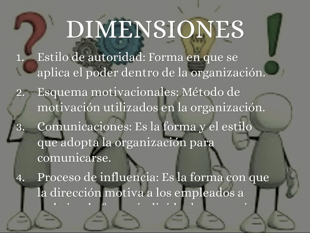 • Estilo de autoridad: Forma en que se aplica el poder dentro de la organización.