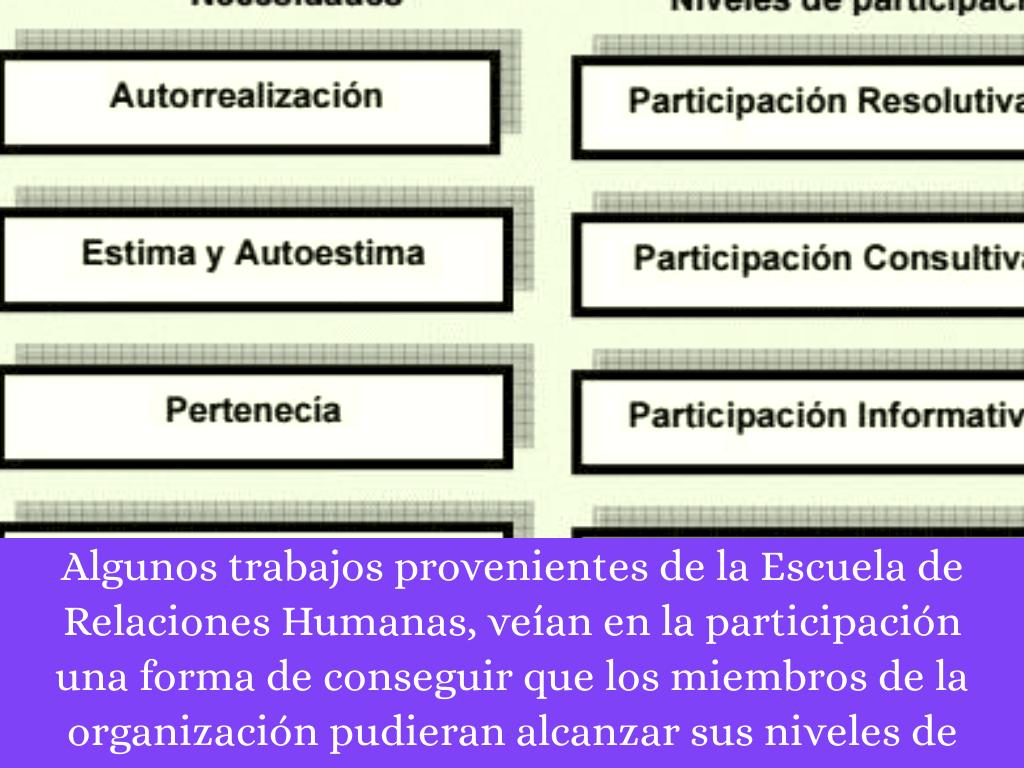 Algunos trabajos provenientes de la Escuela de Relaciones Humanas, veían en la participación una forma de conseguir que los miembros de la organización pudieran alcanzar sus niveles de necesidades superiores, en el esquema de la escala de necesidades de Maslow