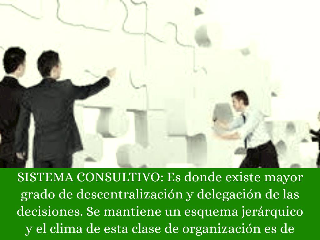 SISTEMA CONSULTIVO: Es donde existe mayor grado de descentralización y delegación de las decisiones. Se mantiene un esquema jerárquico y el clima de esta clase de organización es de confianza y hay niveles altos de responsabilidad.