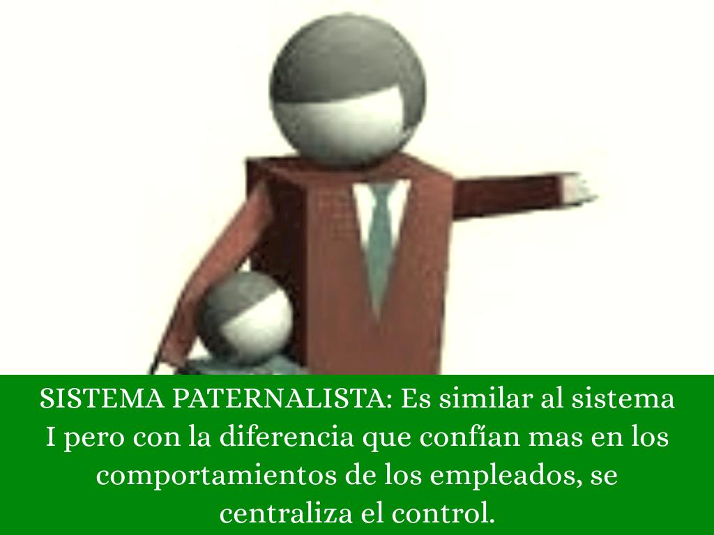 SISTEMA PATERNALISTA: Es similar al sistema I pero con la diferencia que confían mas en los comportamientos de los empleados, se centraliza el control.