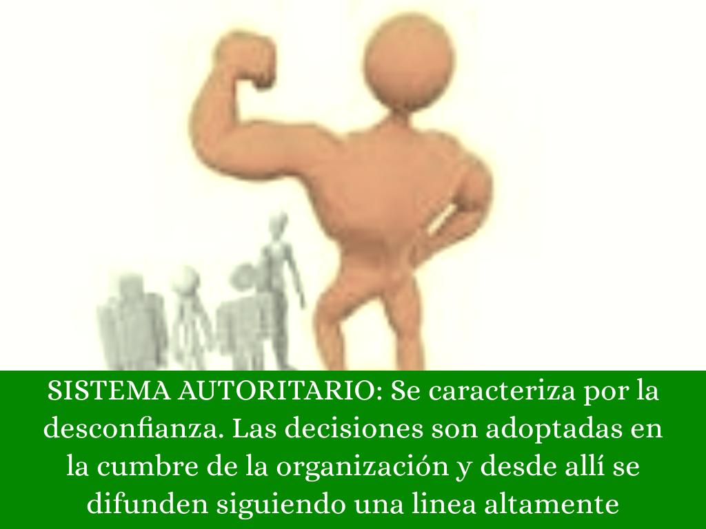 SISTEMA AUTORITARIO: Se caracteriza por la desconfianza. Las decisiones son adoptadas en la cumbre de la organización y desde allí se difunden siguiendo una linea altamente burocrática.