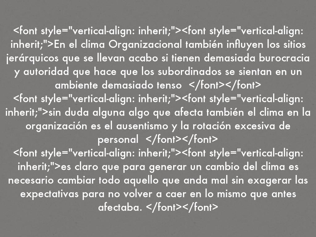 En el clima Organizacional también influyen los sitios jerárquicos que se llevan acabo si tienen demasiada burocracia y autoridad que hace que los subordinados se sientan en un ambiente demasiado tenso