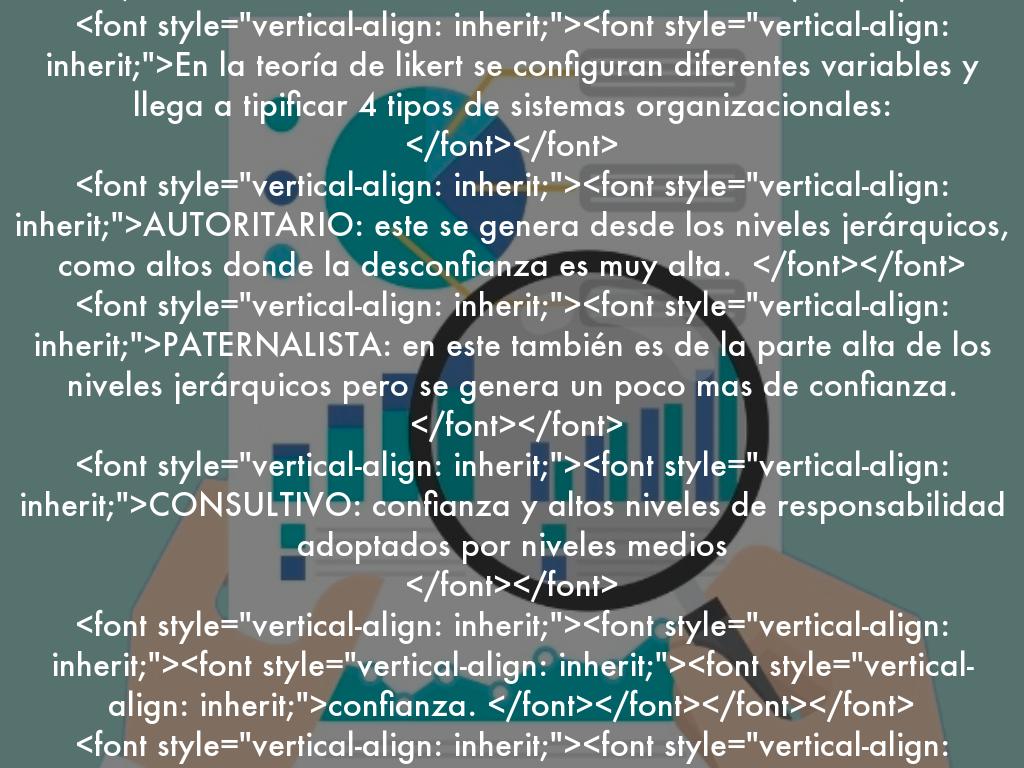 En la teoría de likert se configuran diferentes variables y llega a tipificar 4 tipos de sistemas organizacionales:
