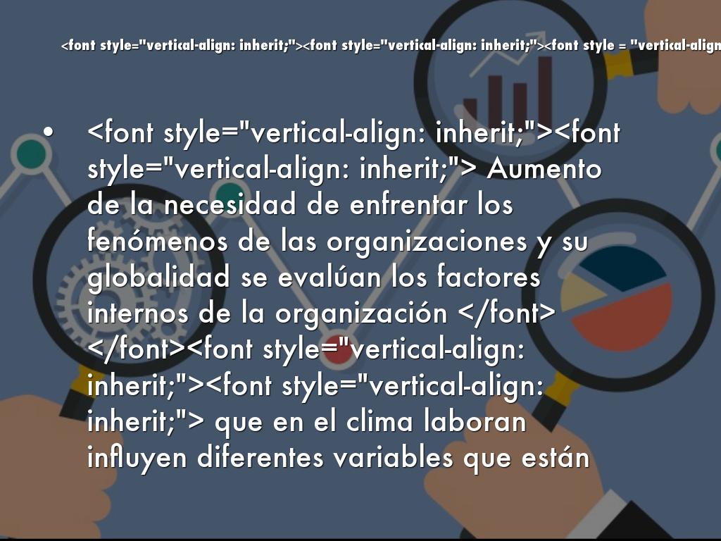 - Aumento de la necesidad de enfrentar los fenómenos de las organizaciones y su globalidad se evalúan los factores internos de la organización que en el clima laboran influyen diferentes variables que están entro del ambiente interno como todo lo que hace parte de la organización interna como infraestructuras los lugares de trabajo las relaciones interpersonales cambio de humor todo lo que podemos tener contacto.