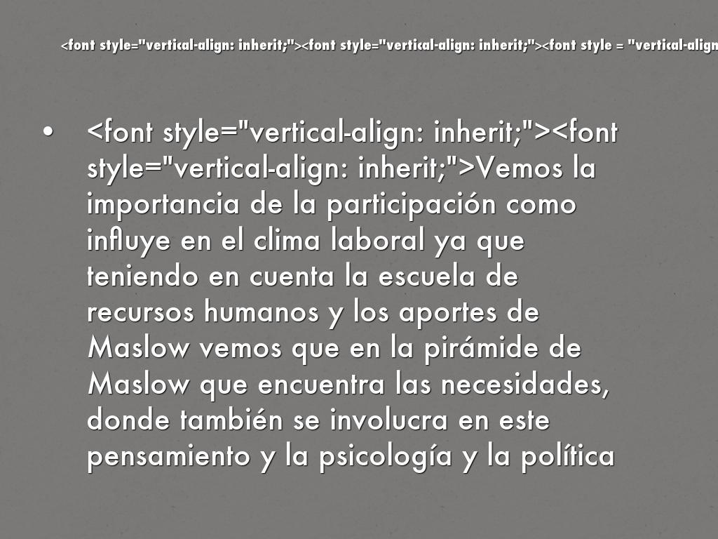 - Vemos la importancia de la participación como influye en el clima laboral ya que teniendo en cuenta la escuela de recursos humanos y los aportes de Maslow vemos que en la pirámide de Maslow que encuentra las necesidades, donde también se involucra en este pensamiento y la psicología y la política estos dos factores digamos que pasa a otro plano y vemos profundidades la piramide de comportamientos y necesidades donde los individuos sientes que sus aportes se adoptan dentro de la organización y generar una autorrealización cuando se tienen en cuenta todos los factores del recurso humano asi mismo esto hace que la productividad aumente en muy buenos niveles teniendo un motivo personal será posible llegar a la meta establecida.