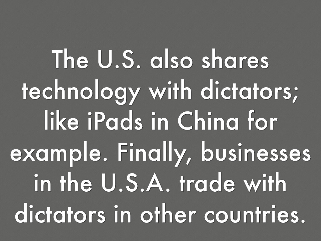 The U.S. also shares technology with dictators; like iPads in China for example. Finally, businesses in the U.S.A. trade with dictators in other countries.