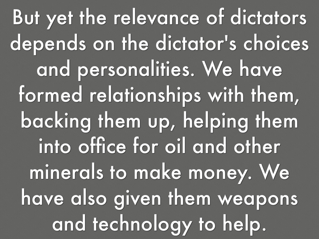 But yet the relevance of dictators depends on the dictator's choices and personalities. We have formed relationships with them, backing them up, helping them into office for oil and other minerals to make money. We have also given them weapons and technology to help.
