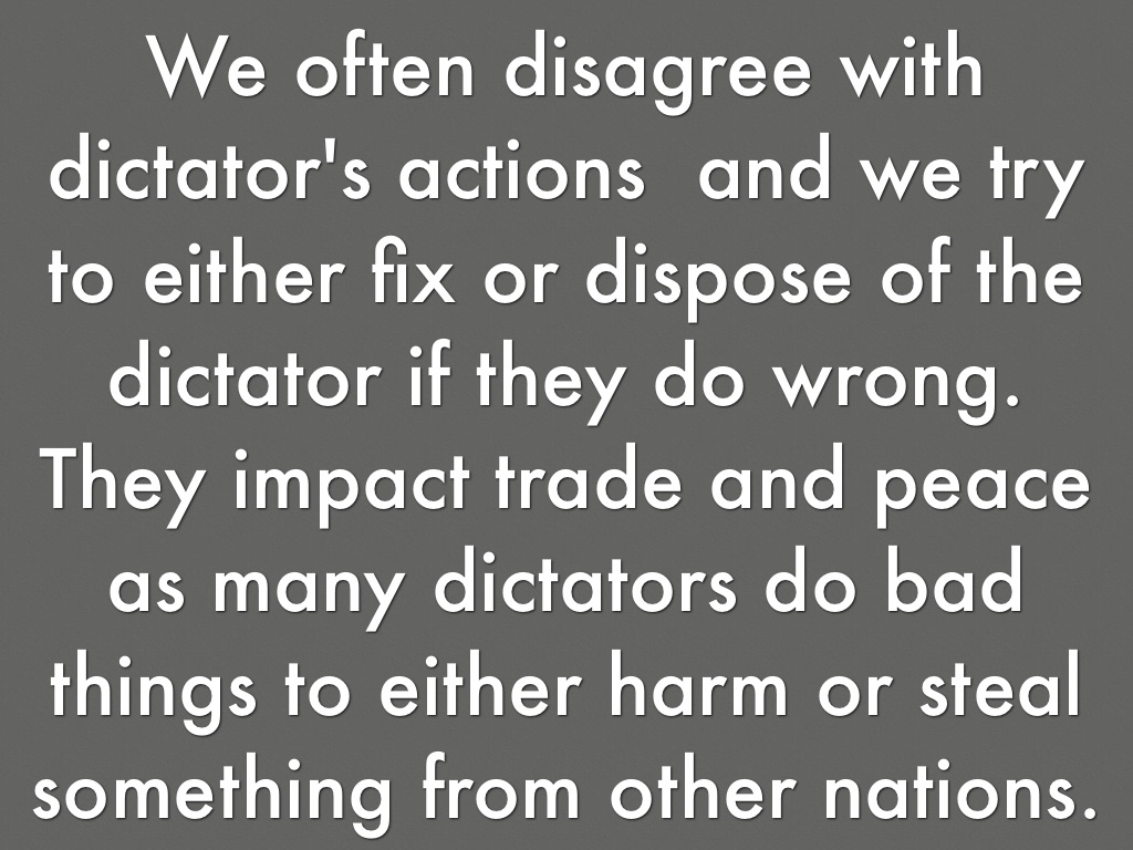 We often disagree with dictator's actions and we try to either fix or dispose of the dictator if they do wrong. They impact trade and peace as many dictators do bad things to either harm or steal something from other nations.
