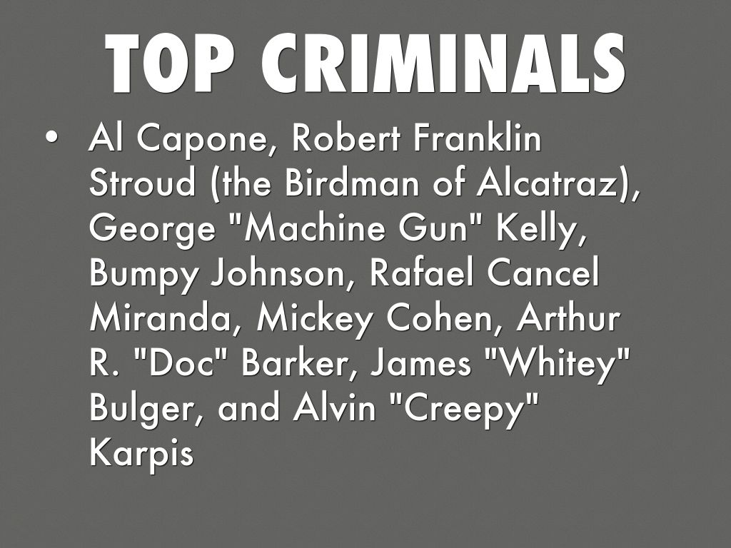 • Al Capone, Robert Franklin Stroud (the Birdman of Alcatraz), George "Machine Gun" Kelly, Bumpy Johnson, Rafael Cancel Miranda, Mickey Cohen, Arthur R. "Doc" Barker, James "Whitey" Bulger, and Alvin "Creepy" Karpis
