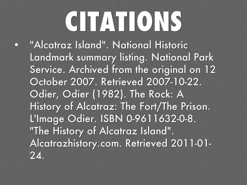 • "Alcatraz Island". National Historic Landmark summary listing. National Park Service. Archived from the original on 12 October 2007. Retrieved 2007-10-22. Odier, Odier (1982). The Rock: A History of Alcatraz: The Fort/The Prison. L'Image Odier. ISBN 0-9611632-0-8. "The History of Alcatraz Island". Alcatrazhistory.com. Retrieved 2011-01-24. "BOP: Alcatraz". Bop.gov. Archived from the original on 9 January 2011. Retrieved 2011-01-24 "Alcatraz Island – History & Culture (U.S. National Park Service)". Nps.gov. 2010-03-27. Archived from the original on 28 February 2011. Retrieved 2011-01-24.