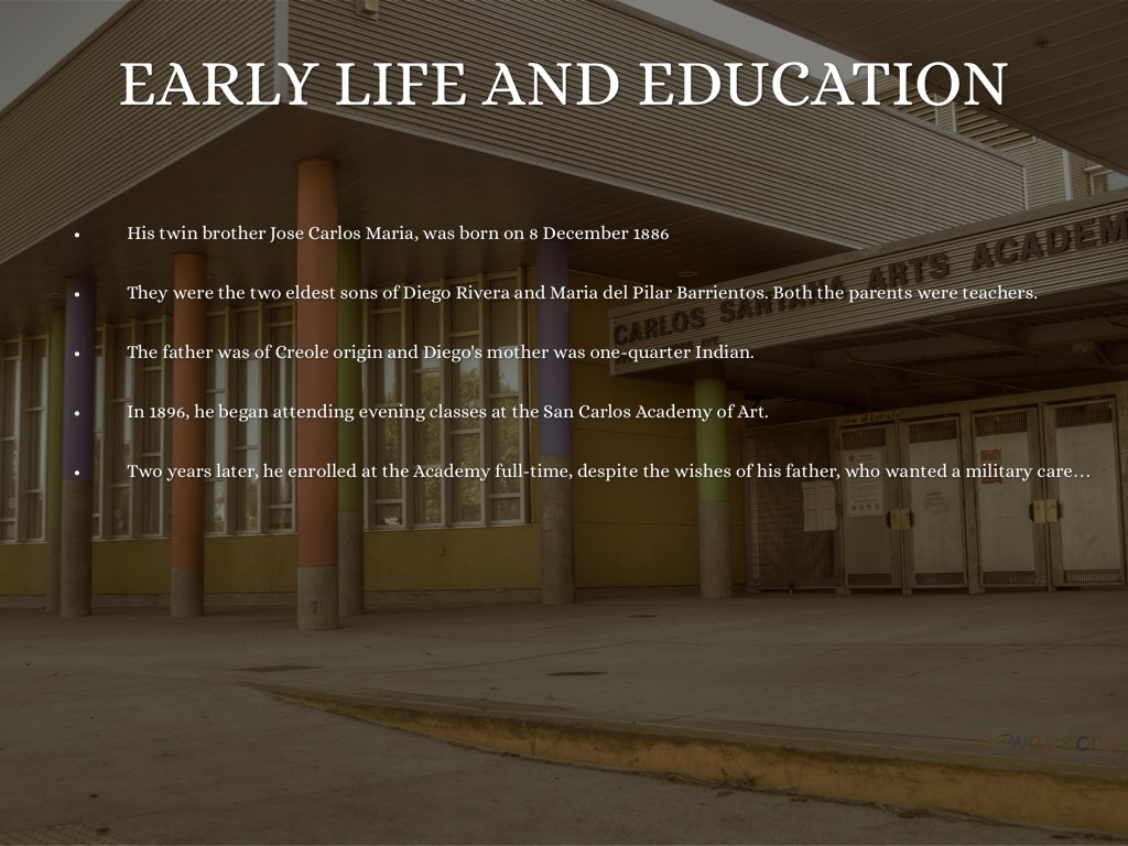 He began drawing as a child. Around the age of 10, Rivera went to study art at the San Carlos Academy of Fine Arts in Mexico City.