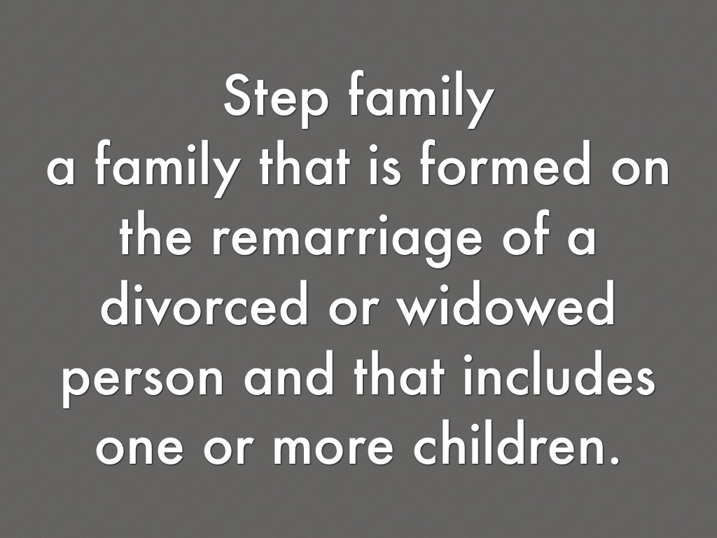 a family that is formed on the remarriage of a divorced or widowed person and that includes one or more children.