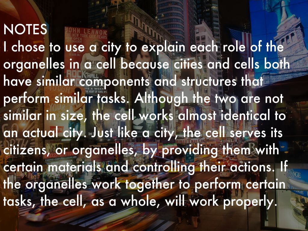 I chose to use a city to explain each role of the organelles in a cell because cities and cells both have similar components and structures that perform similar tasks. Although the two are not similar in size, the cell works almost identical to an actual city. Just like a city, the cell serves its citizens, or organelles, by providing them with certain materials and controlling their actions. If the organelles work together to perform certain tasks, the cell, as a whole, will work properly.
