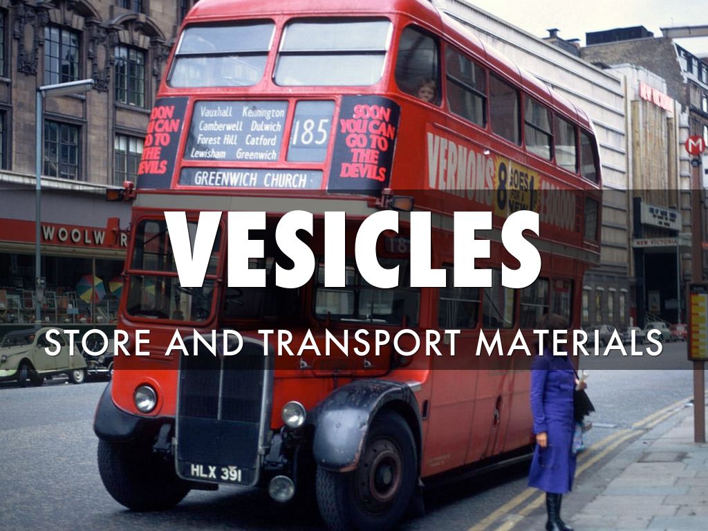 A vesicle is like a city's transportation system because it transports materials throughout the cell, much like a bus transports people.