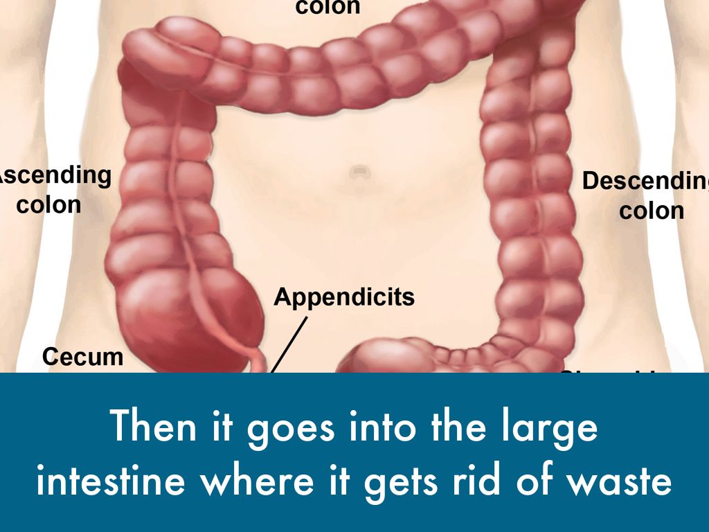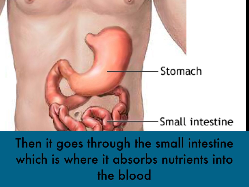 Then it goes through the small intestine which is where it absorbs nutrients into the blood