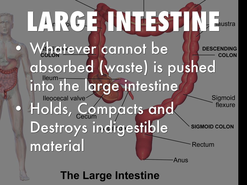 Whatever cannot be absorbed (waste) is pushed into the large intestine
