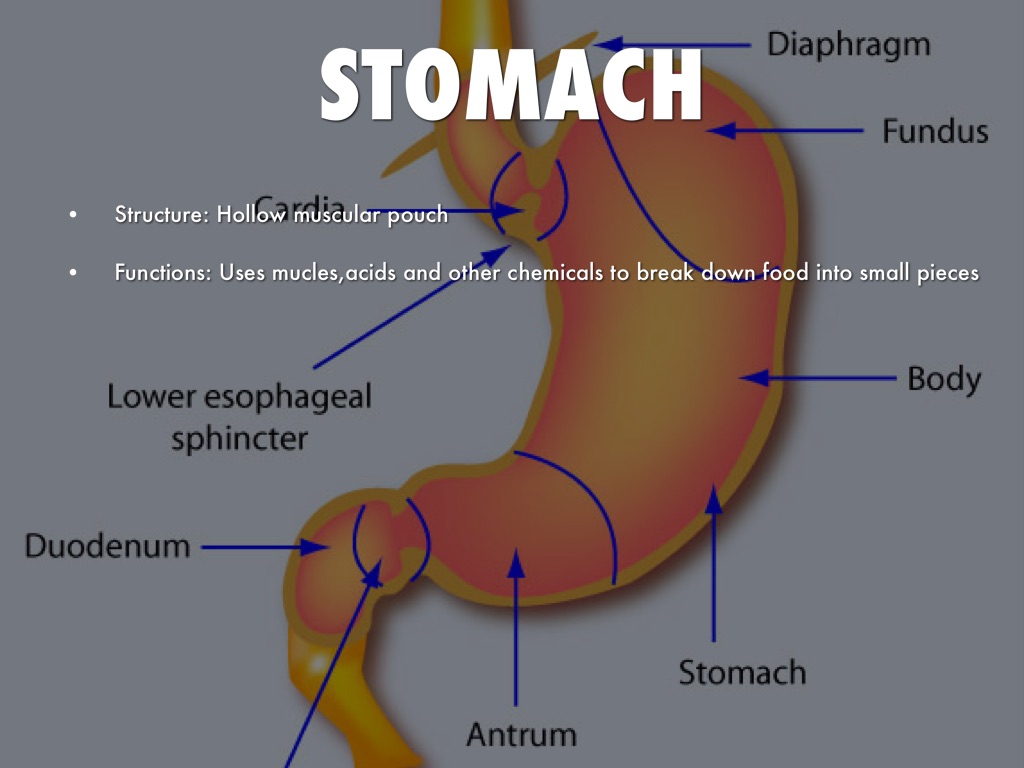 Functions: Uses mucles,acids and other chemicals to break down food into small pieces