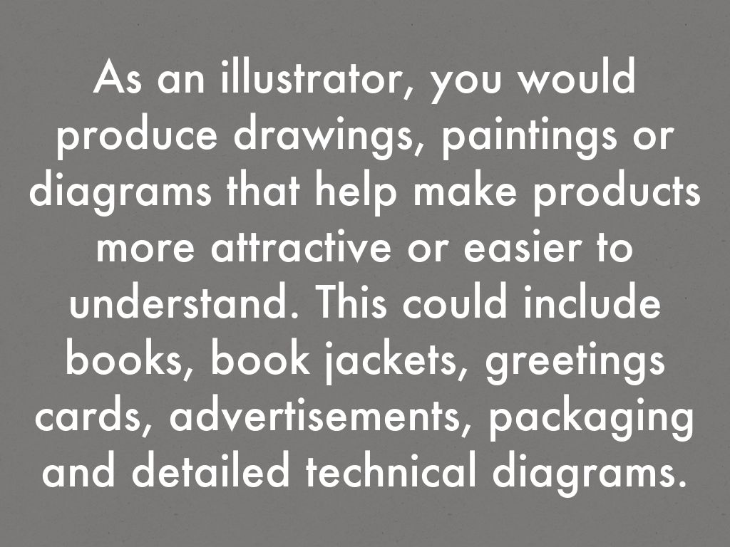 As an illustrator, you would produce drawings, paintings or diagrams that help make products more attractive or easier to understand. This could include books, book jackets, greetings cards, advertisements, packaging and detailed technical diagrams.