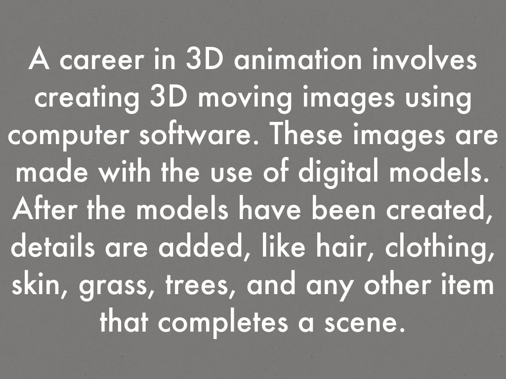 A career in 3D animation involves creating 3D moving images using computer software. These images are made with the use of digital models. After the models have been created, details are added, like hair, clothing, skin, grass, trees, and any other item that completes a scene.