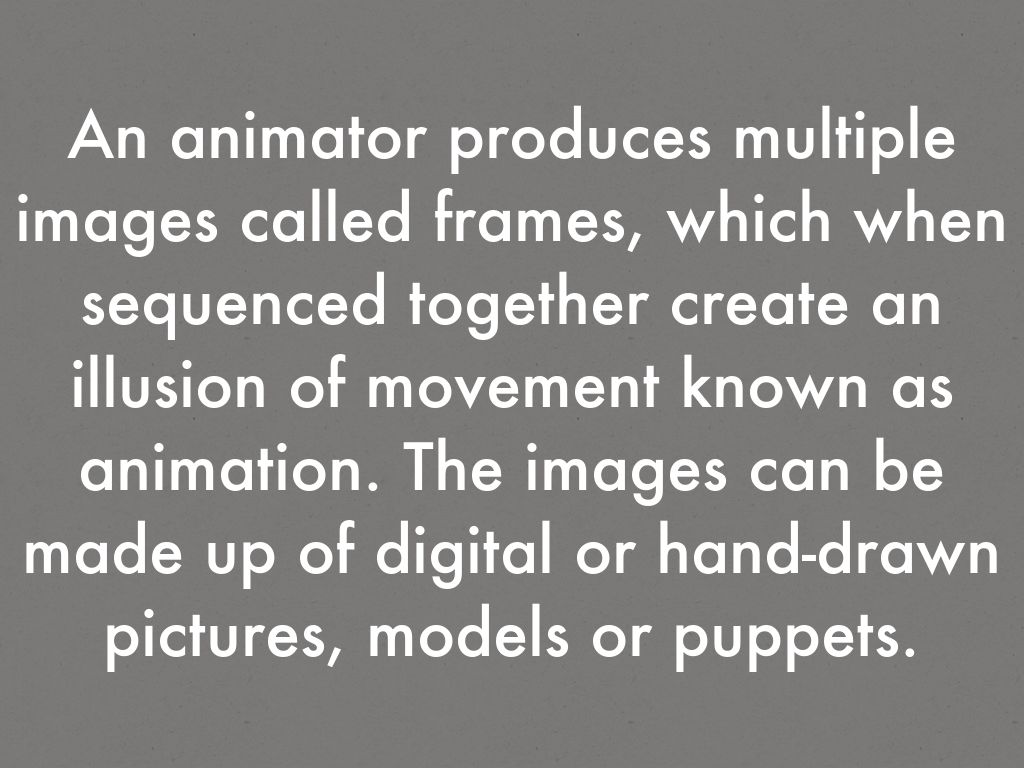 An animator produces multiple images called frames, which when sequenced together create an illusion of movement known as animation. The images can be made up of digital or hand-drawn pictures, models or puppets.