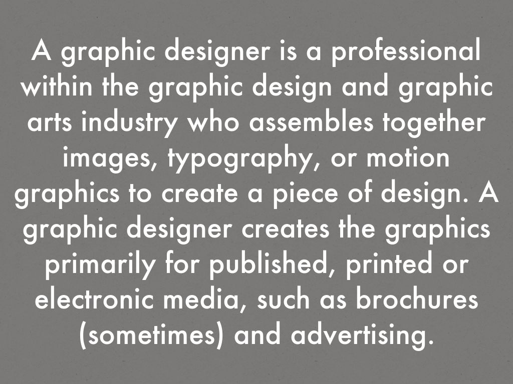 A graphic designer is a professional within the graphic design and graphic arts industry who assembles together images, typography, or motion graphics to create a piece of design. A graphic designer creates the graphics primarily for published, printed or electronic media, such as brochures (sometimes) and advertising.