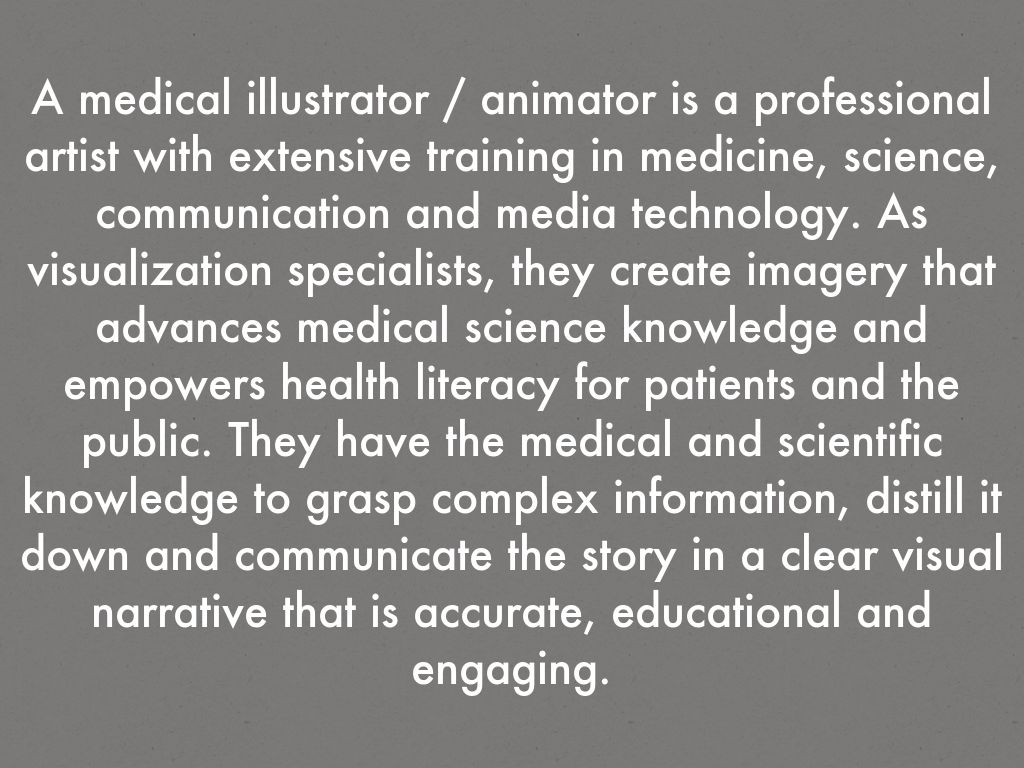 A medical illustrator / animator is a professional artist with extensive training in medicine, science, communication and media technology. As visualization specialists, they create imagery that advances medical science knowledge and empowers health literacy for patients and the public. They have the medical and scientific knowledge to grasp complex information, distill it down and communicate the story in a clear visual narrative that is accurate, educational and engaging.