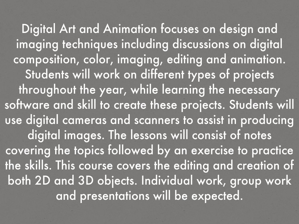 Digital Art and Animation focuses on design and imaging techniques including discussions on digital composition, color, imaging, editing and animation. Students will work on different types of projects throughout the year, while learning the necessary software and skill to create these projects. Students will use digital cameras and scanners to assist in producing digital images. The lessons will consist of notes covering the topics followed by an exercise to practice the skills. This course covers the editing and creation of both 2D and 3D objects. Individual work, group work and presentations will be expected.