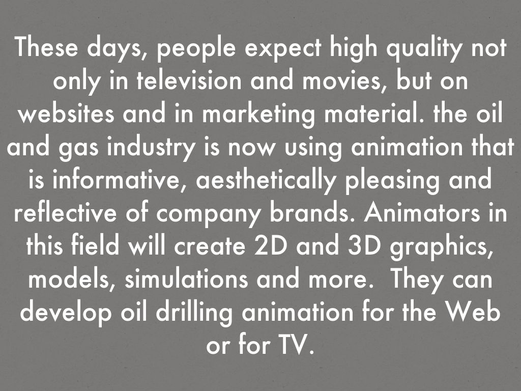 These days, people expect high quality not only in television and movies, but on websites and in marketing material. the oil and gas industry is now using animation that is informative, aesthetically pleasing and reflective of company brands. Animators in this field will create 2D and 3D graphics, models, simulations and more. They can develop oil drilling animation for the Web or for TV.