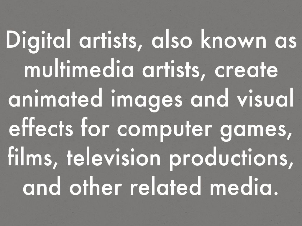 Digital artists, also known as multimedia artists, create animated images and visual effects for computer games, films, television productions, and other related media.